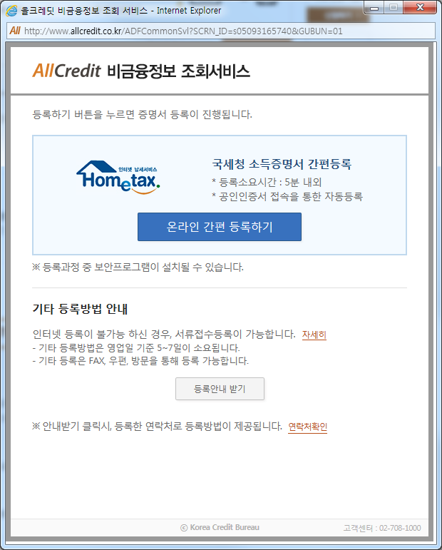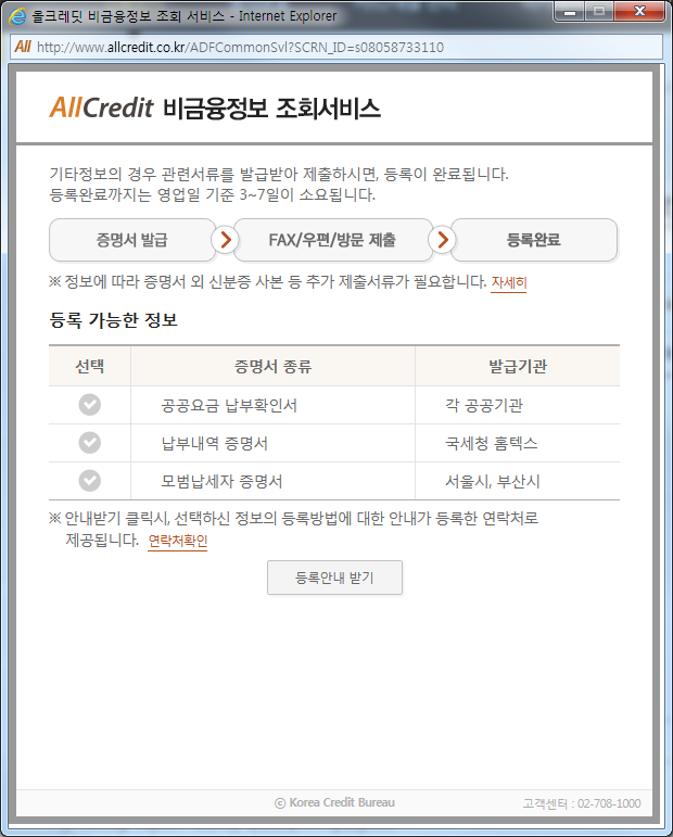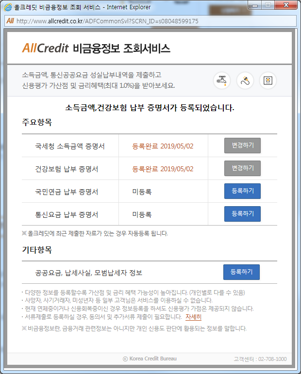 비금융정보 중 국세청 소득금액 증명서, 건강보험 납부 증명서, 국민연금 납부 증명서, 통신요금 납부 증명서 4종은 간단히 공인인증서 등의 인증 및 동의 만으로 간단하게 바로 등록이 가능하고