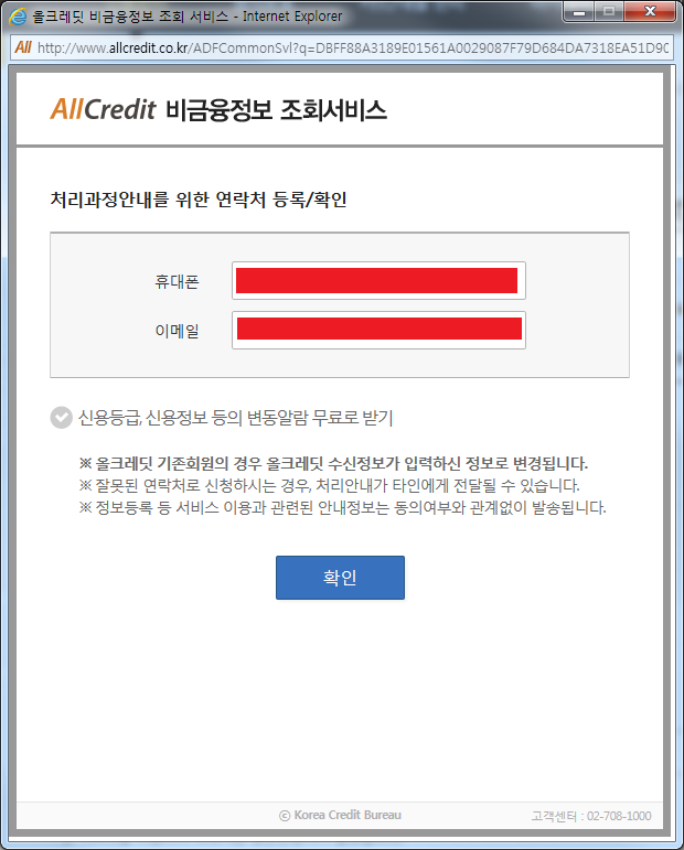 확인을 누르면 신용등급 무료알람 서비스를 제공하는데 받지 않을 거냐고 물어보는데