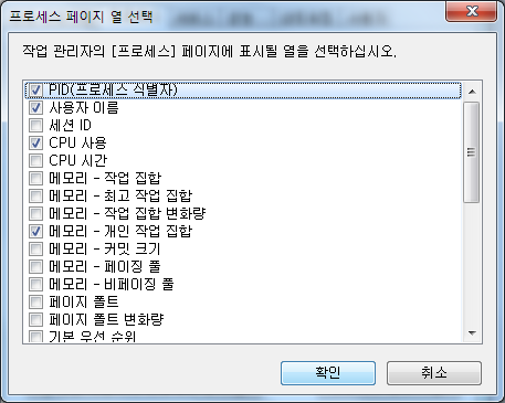 4. PID(프로세스 식별자)를 체크하고 [확인] 버튼을 누른다.