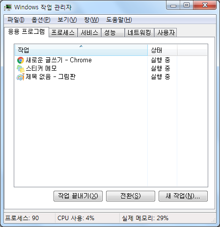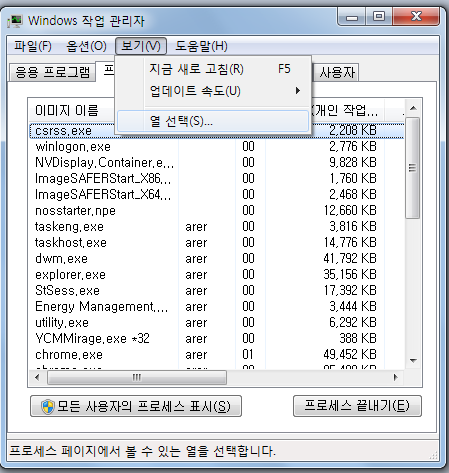 1. 작업관리자를 연다.(Ctrl+Alt+Del키 또는 하단 작업표시줄에서 마우스 오른쪽 클릭하여 [작업관리자 시작]클릭)