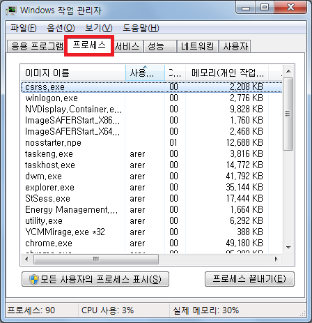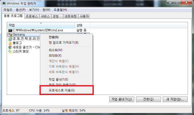 프로세스를 찾기 못 할 때는 [응용 프로그램]탭에서 해당 프로그램에서 마우스 오른쪽 클릭 한 후 [프로세스로 이동]버튼을 클릭해주면 바로 찾을 수 있다.
