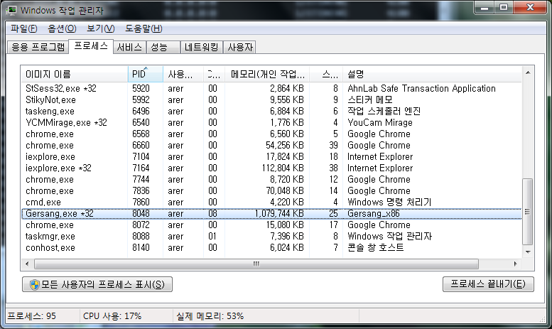 내가 찾을 거상 프로그램의 PID는 8048이다. 이 값을 기억해둔다.