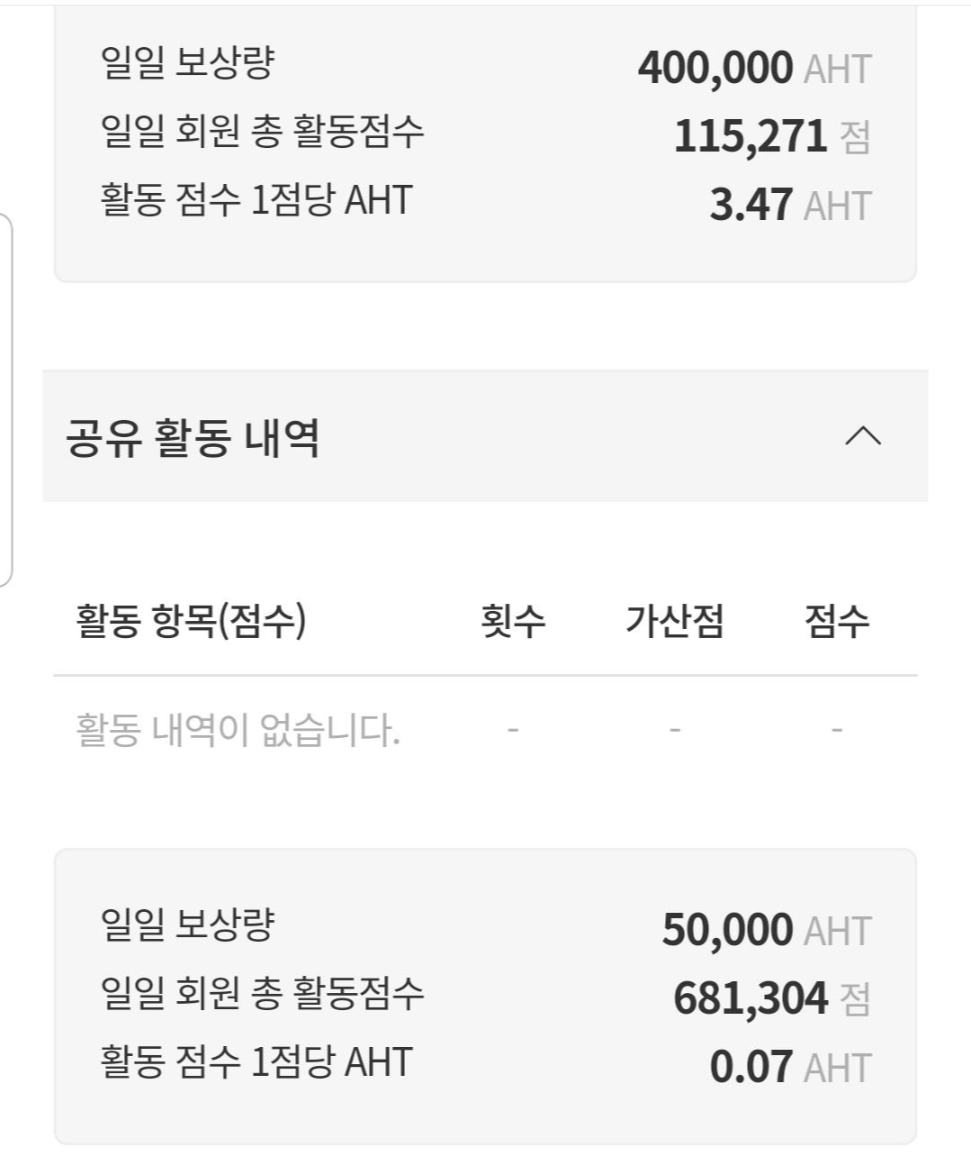 이를 모든사용자가 하루동안 활동해서 얻은 포인트로 나눠서 점수당 아하토큰을 받는 구조이다.