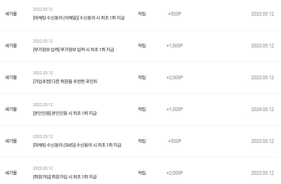 또 가입시 2000포인트, 마케팅 동의시 1000포인트(sms, 이메일 각각), 부가정보입력시 1000포인트, 본인인증시 1000포인트, 추천인 입력시 2000포인트(추천인 deooo)를 지급해서