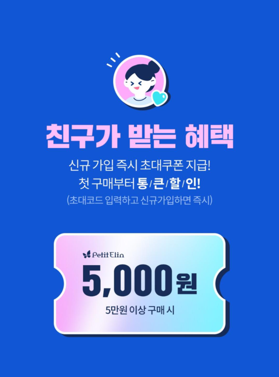 쁘띠엘린에 가입할 때 초대코드 입력 시 5000원 할인쿠폰을 제공한다.