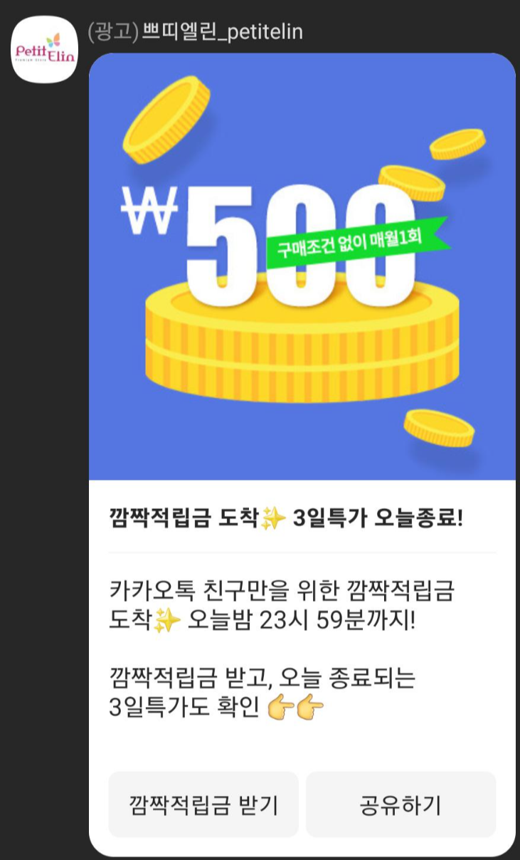쁘띠엘린 카카오채널 친구추가를 하면 3,000원 할인 쿠폰과