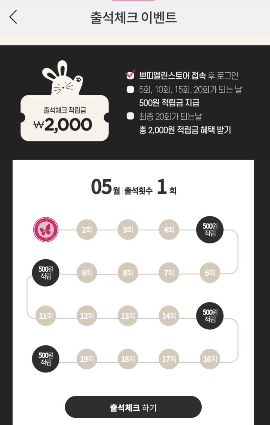 한달에 20일 출석 시 총 2,000원을 적립받을 수 있다.