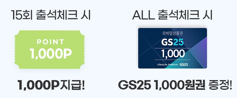 15회 출석체크 시 마다 1,000포인트, 개근 시 GS25 1,000원 기프티콘을 준다.