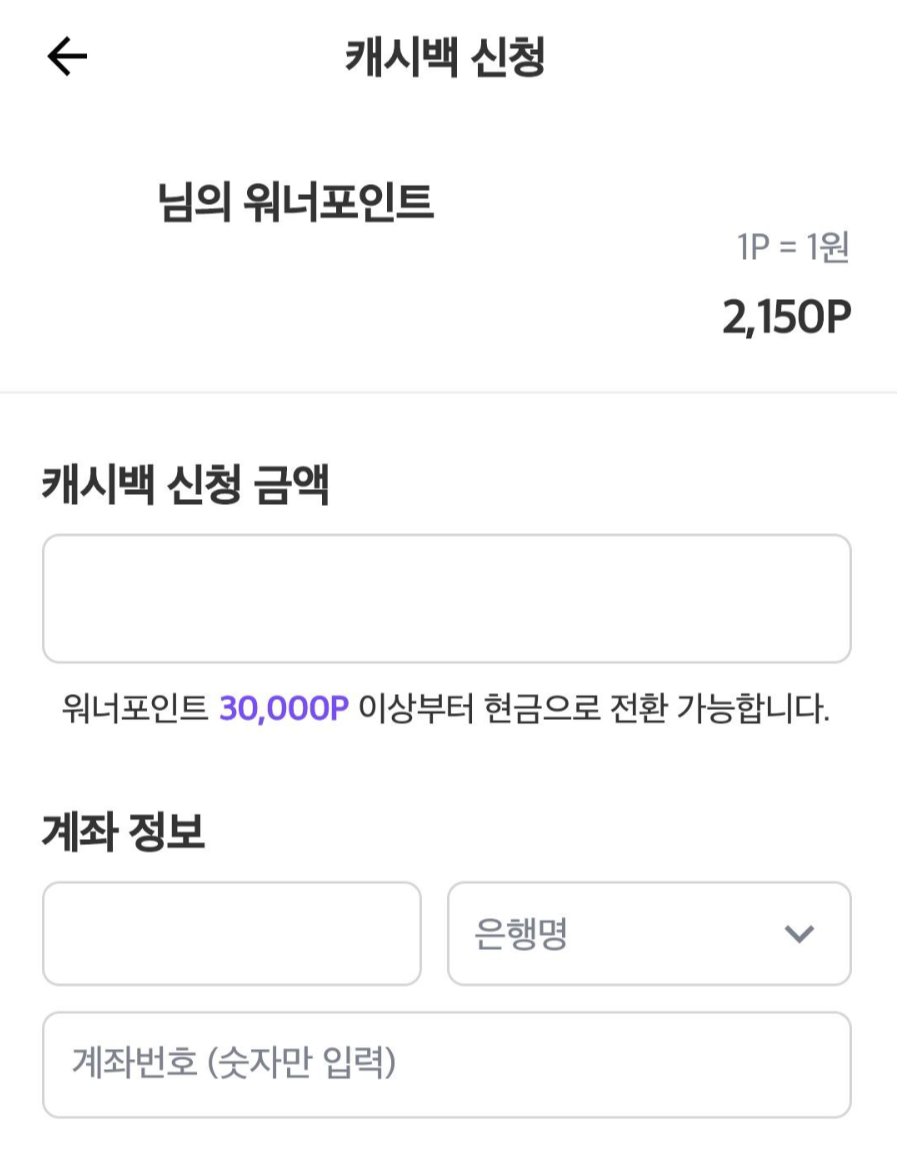 캐시백 신청은 30,000포인트 부터 신청할 수 있다.
