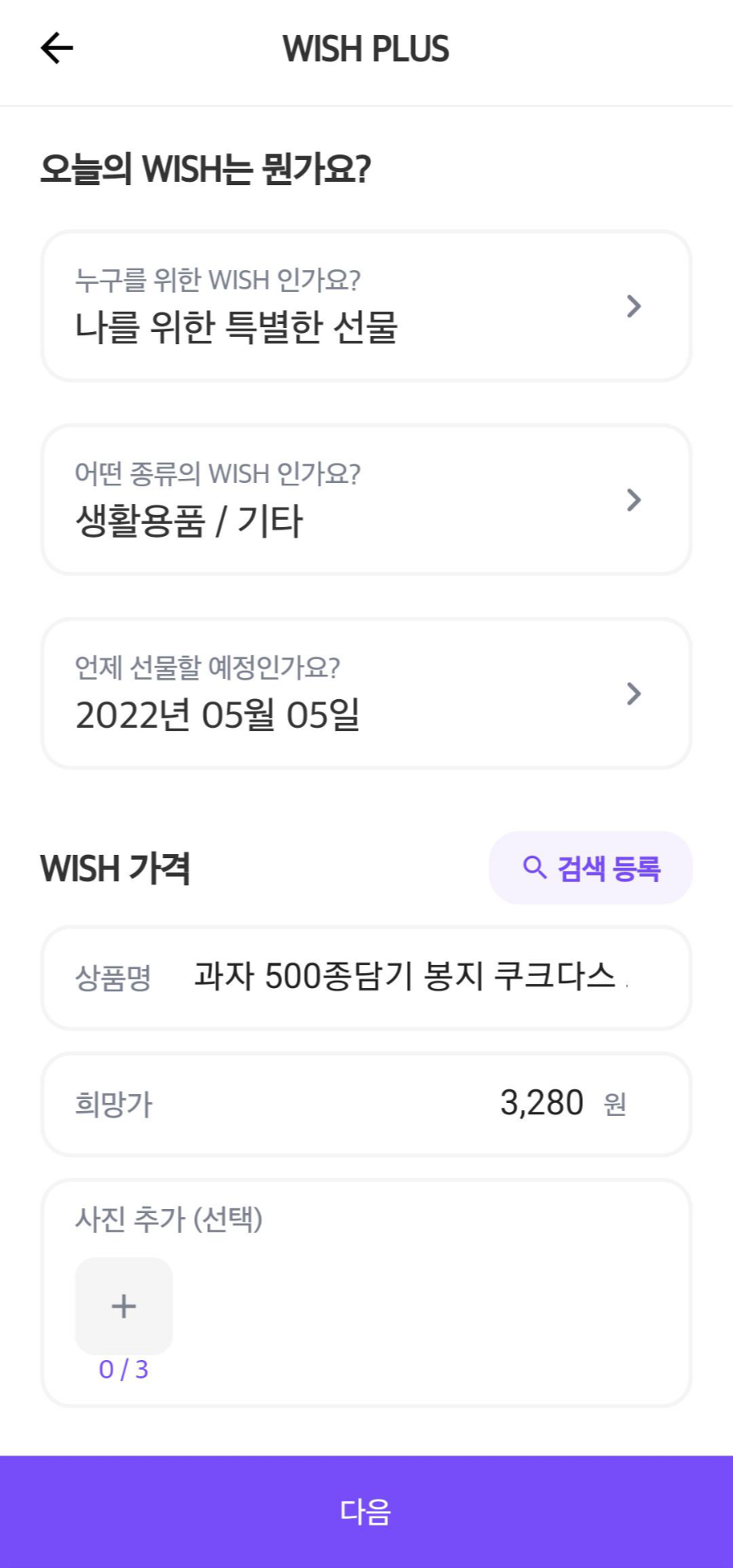 메인화면 상단에 +버튼을 눌러서 위시를 등록할 수 있다.