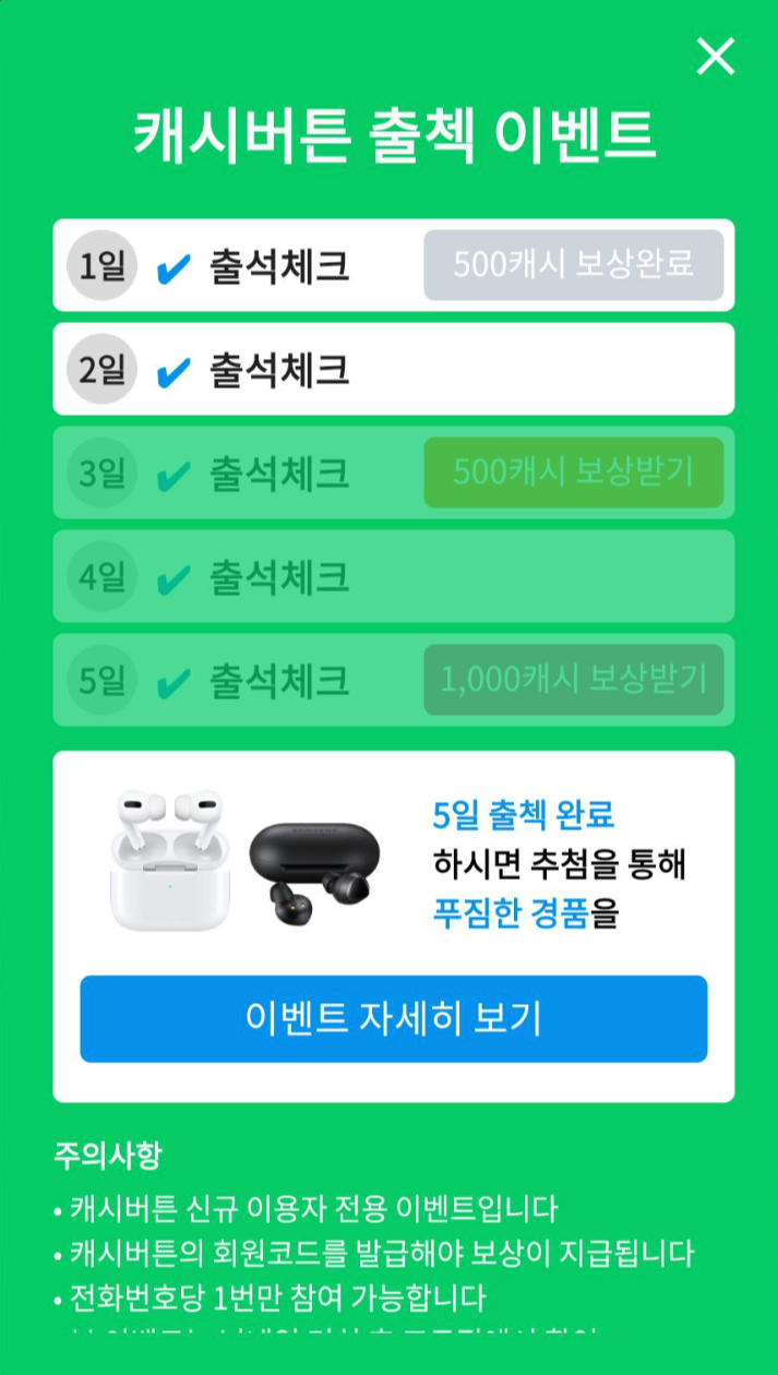 5일 출석 시 2,000캐시까지 받을 수 있다.