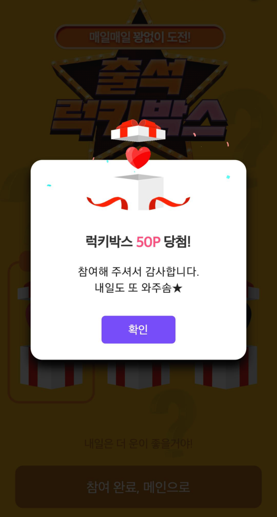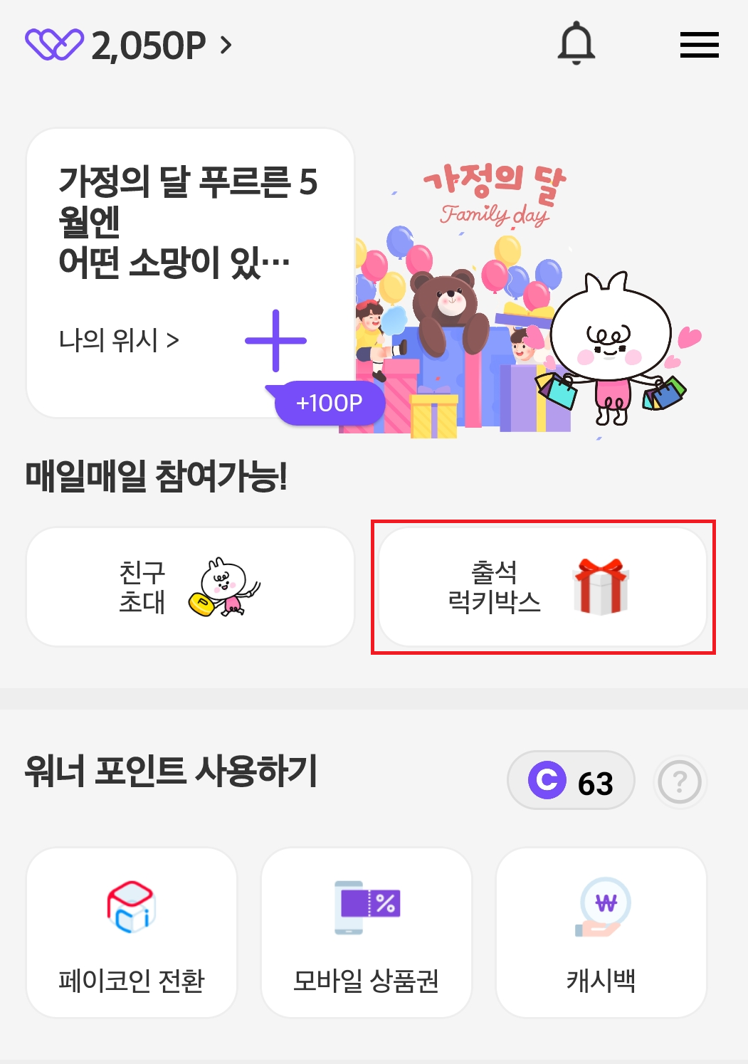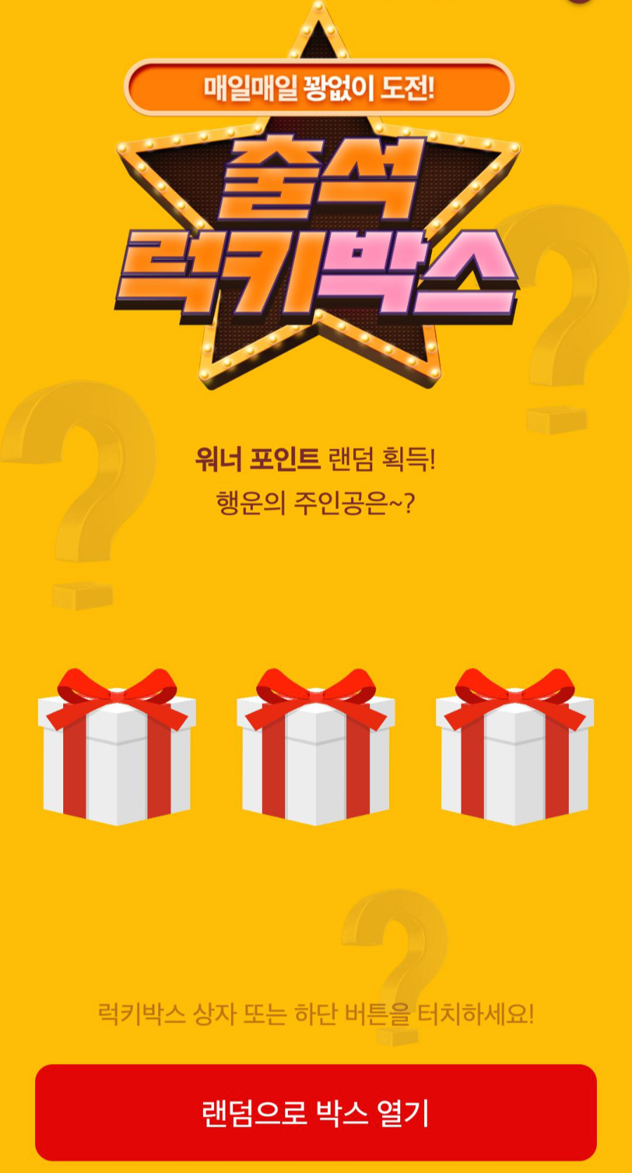 워너포인트 출석체크는 메인화면의 출석럭키박스 버튼을 통해 얻을 수 있다.