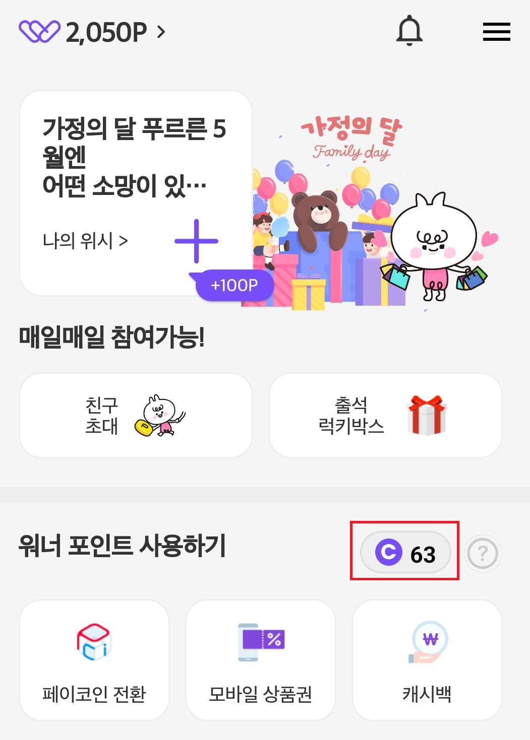이렇게 모은 워너포인트를 페이코인 전환, 모바일 상품권 구매, 캐시백 신청을 할 수 있다.