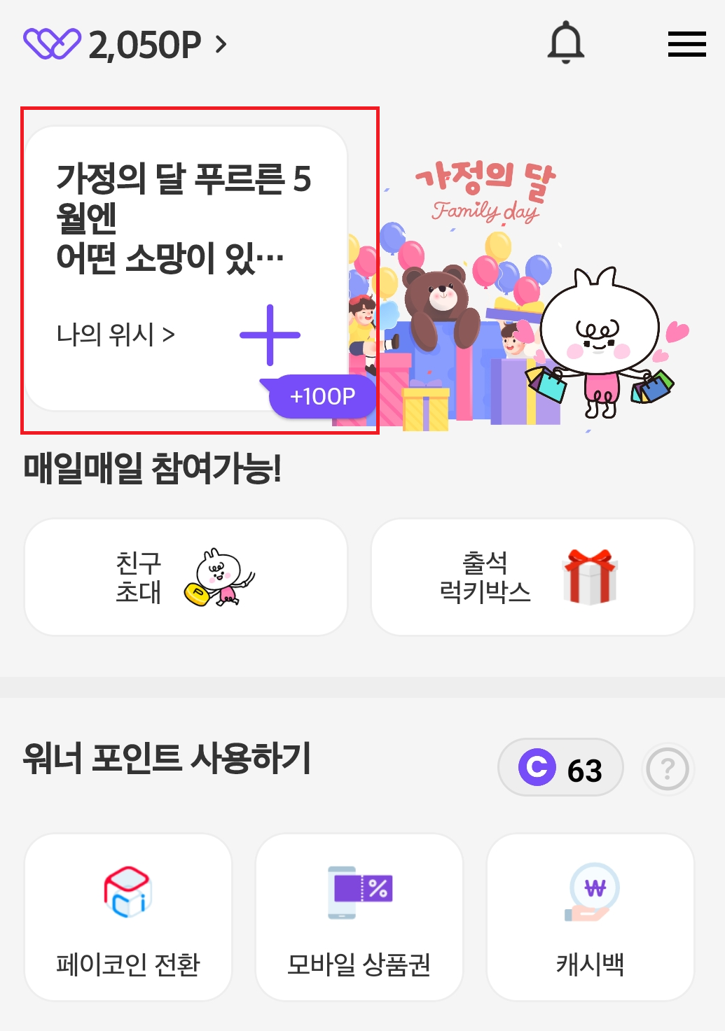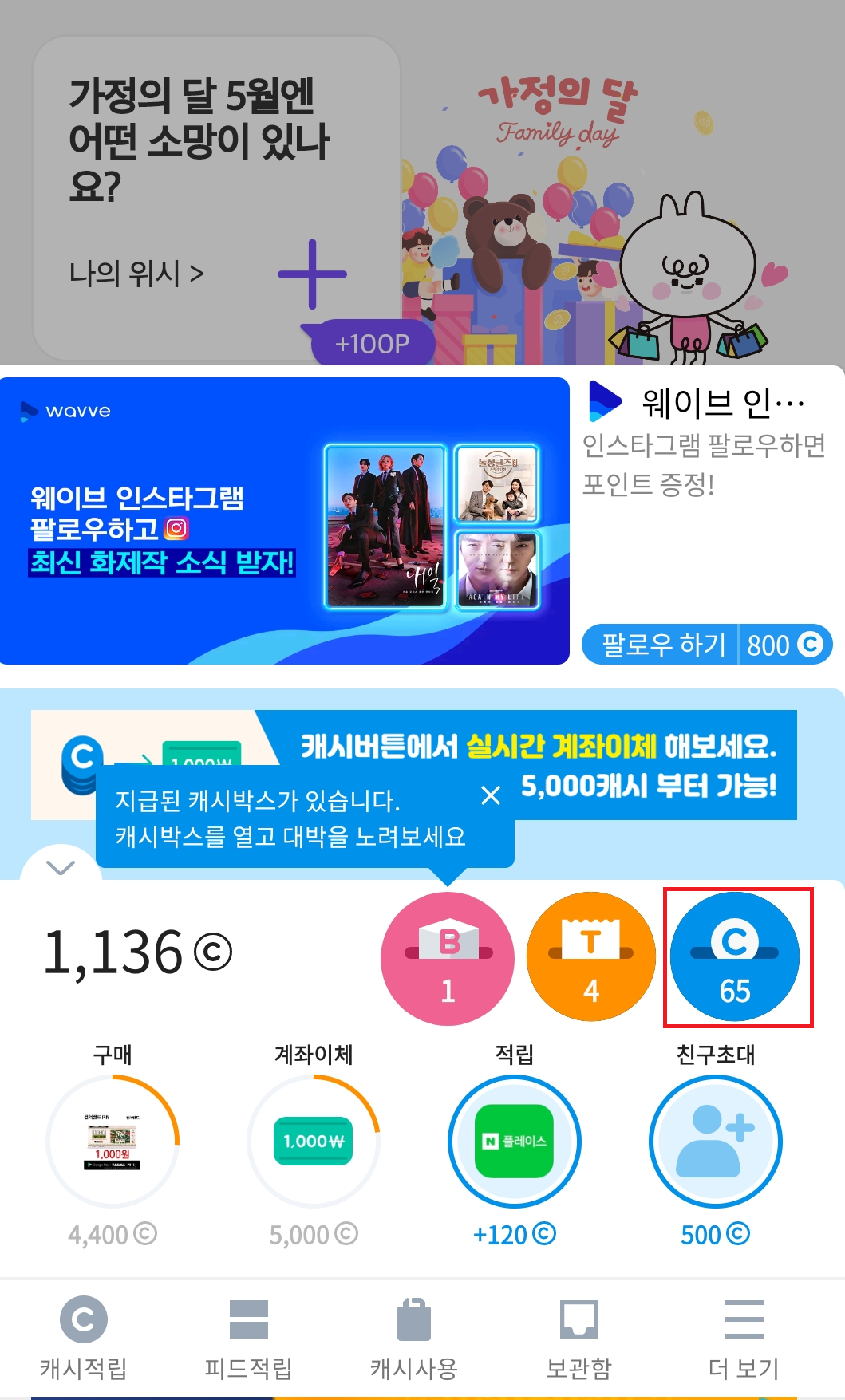 워너캐시는 아래 사진의 붉은 박스부분을 클릭하면 1캐시씩 적립해준다.