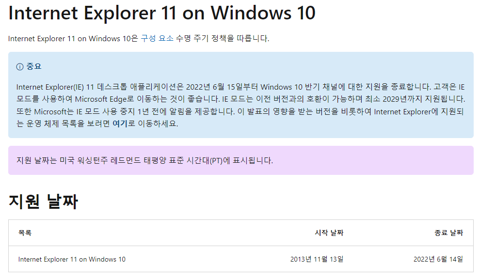 Internet Explorer 11 on Windows 10은 구성 요소 수명 주기 정책을 따릅니다.