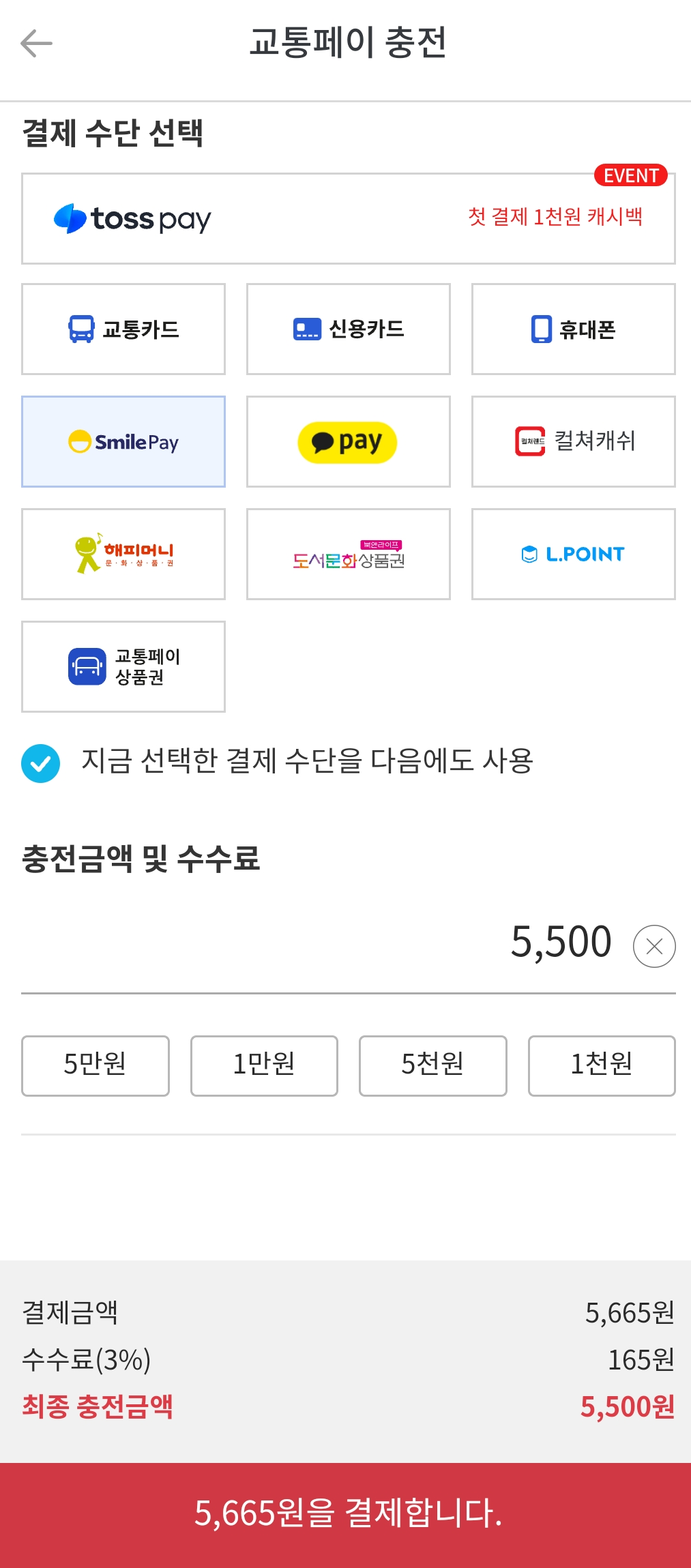(다른 블로그 포스팅에 보면 푸른색 상자 충전버튼을 이용해서 충전하고 티머니 등 실물교통카드를 이용하라고 하는데 다 필요없다. 그냥 교통페이 충전기능을 이용하면 된다.)