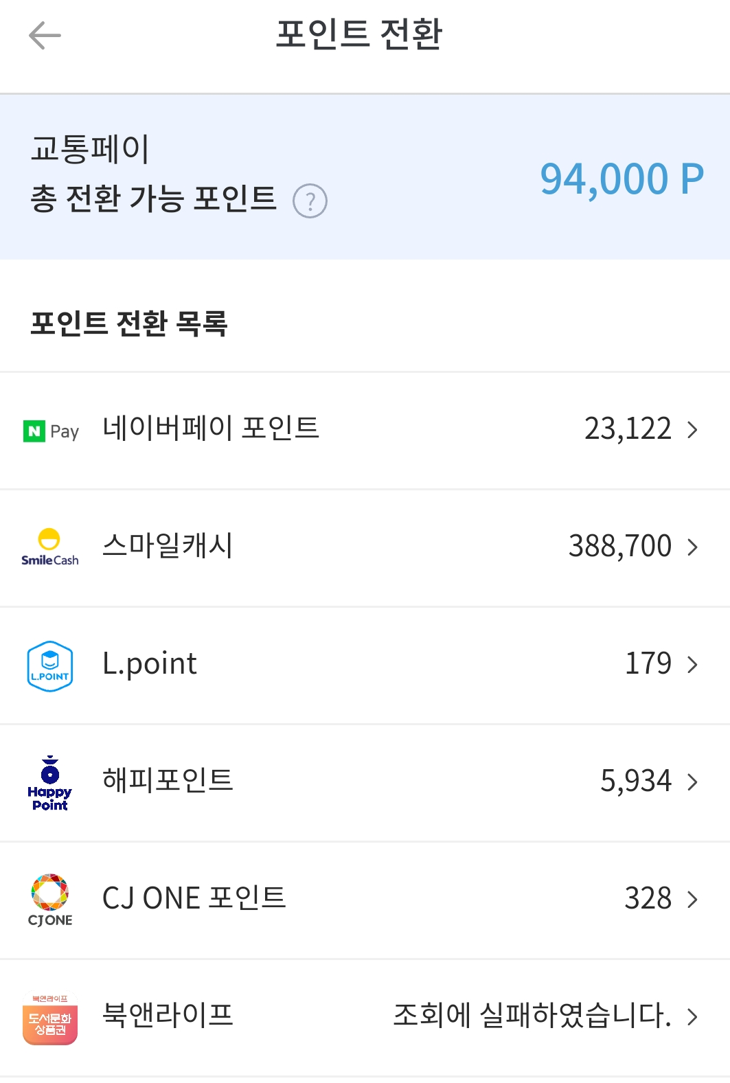 네이버페이, 스마일캐시, 엘포인트, 해피포인트, CJ ONE포인트, 북앤라이프 포인트로 전환이 가능하다.