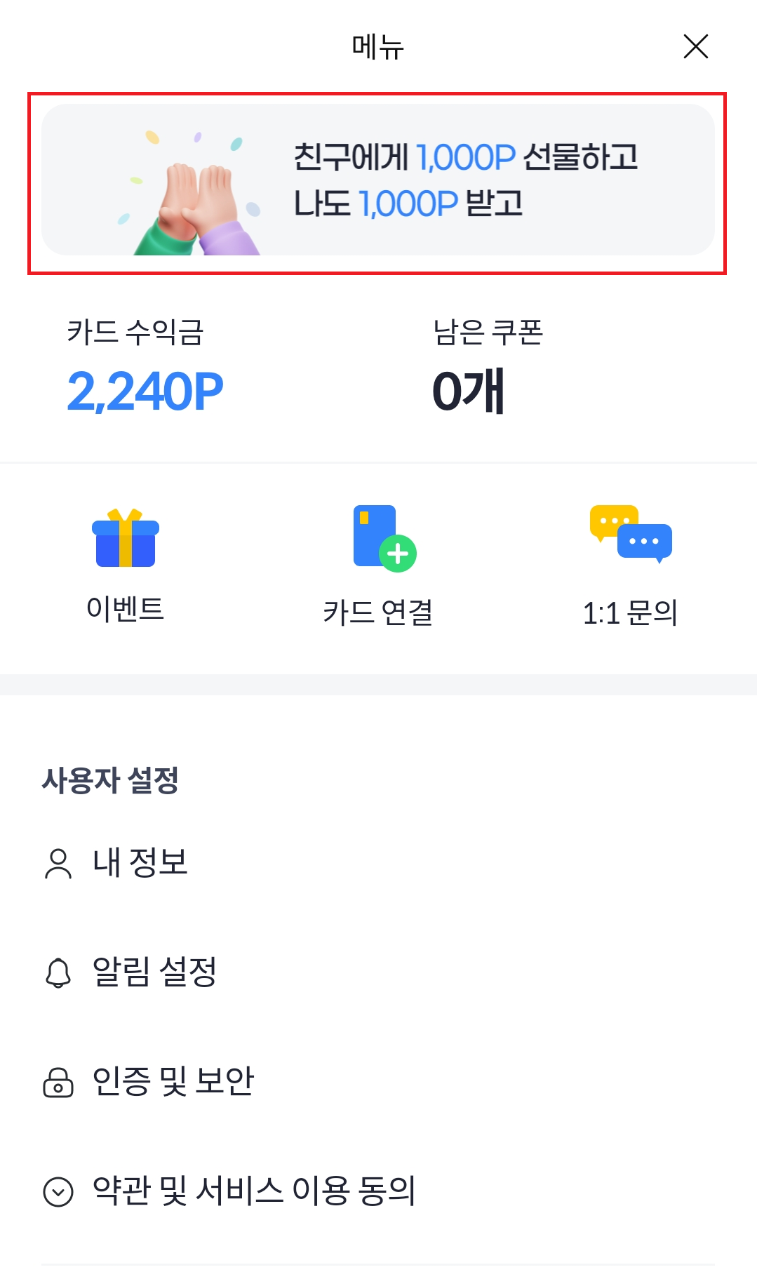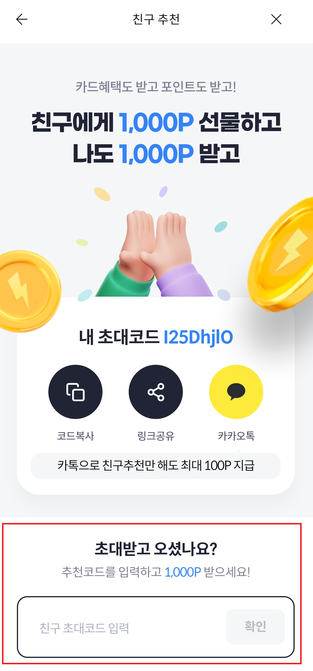 아직 설치하지 않은 사람은 추천인 입력을 하면 1000포인트를 받을 수 있다.