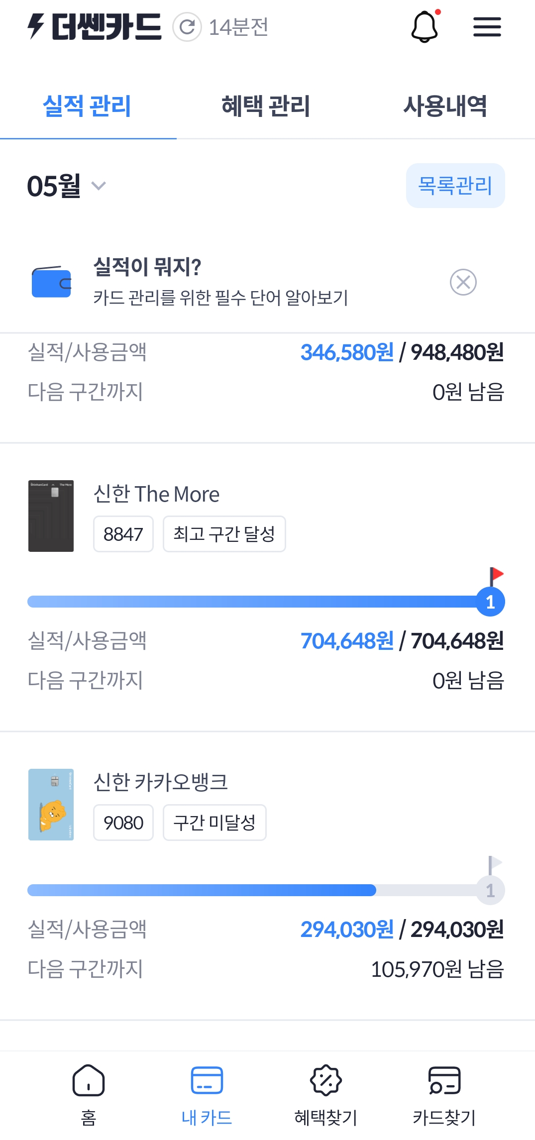 이외에도 더쌘카드 앱에서는 내카드 실적을 보기좋게 보여주거나