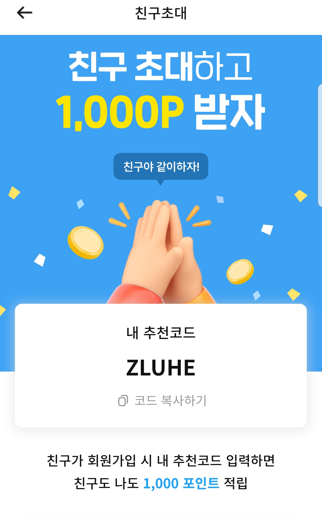 초대코드 ZLUHE를 입력해서 1000포인트 받고 시작하자.