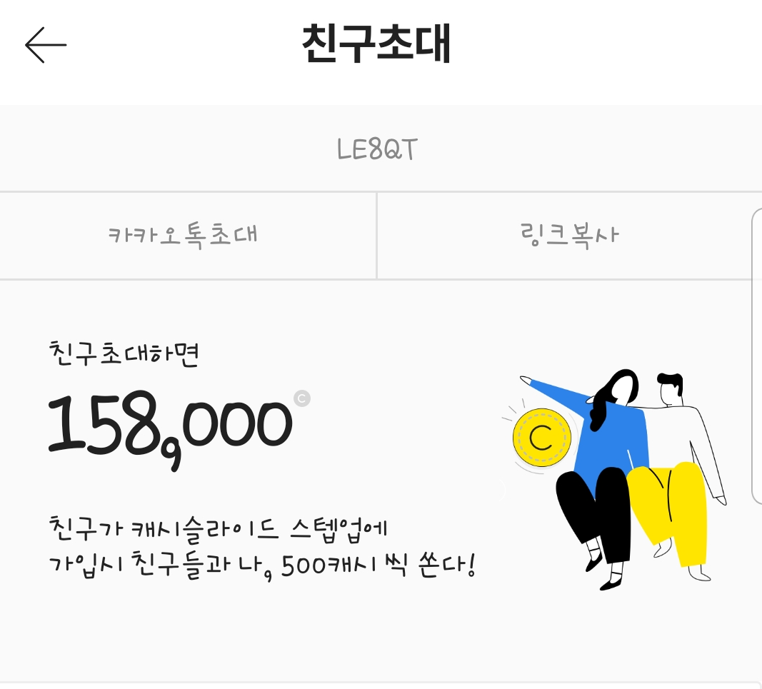 아직 가입안하신 분들은 캐시슬라이드 초대코드(추천코드)를 입력하면 500캐시를 받을 수 있다.