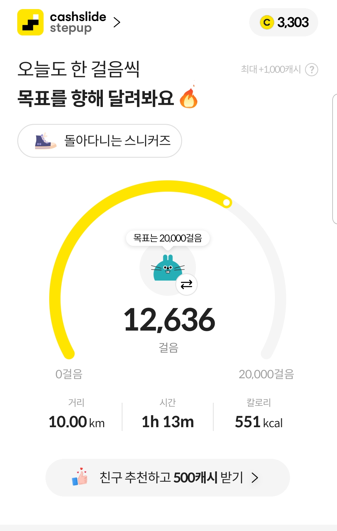 대신 목표걸음수를 달성하면 최대1000캐시까지 추가캐시 적립을 받을 수 있는데