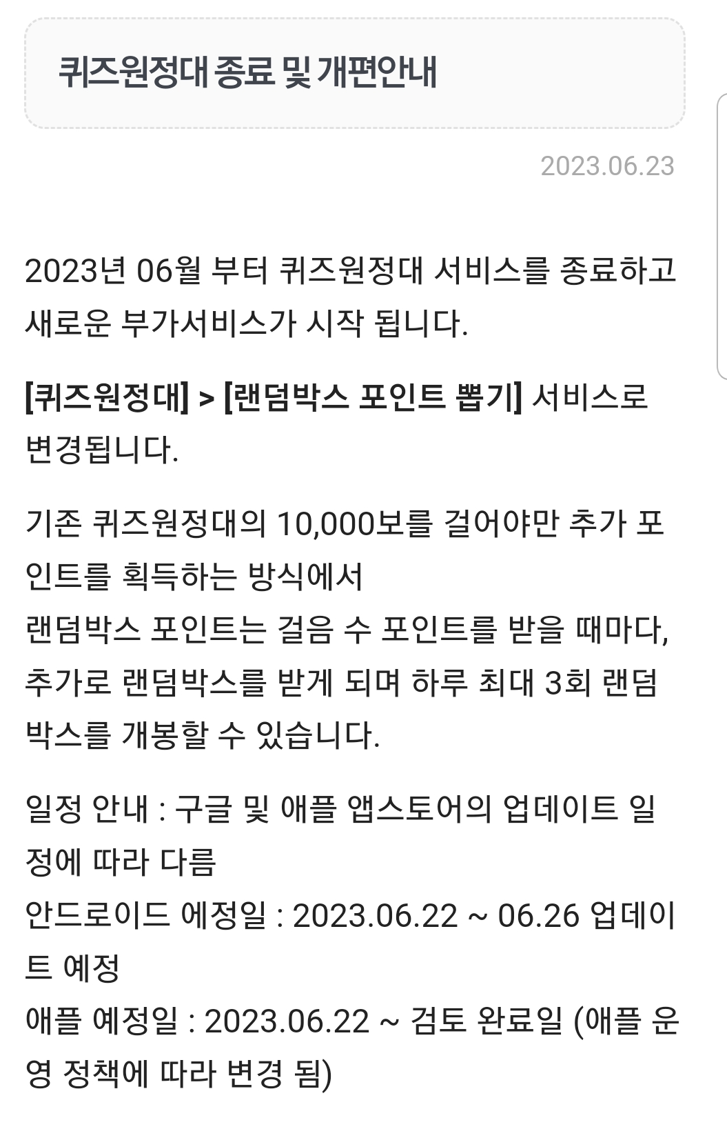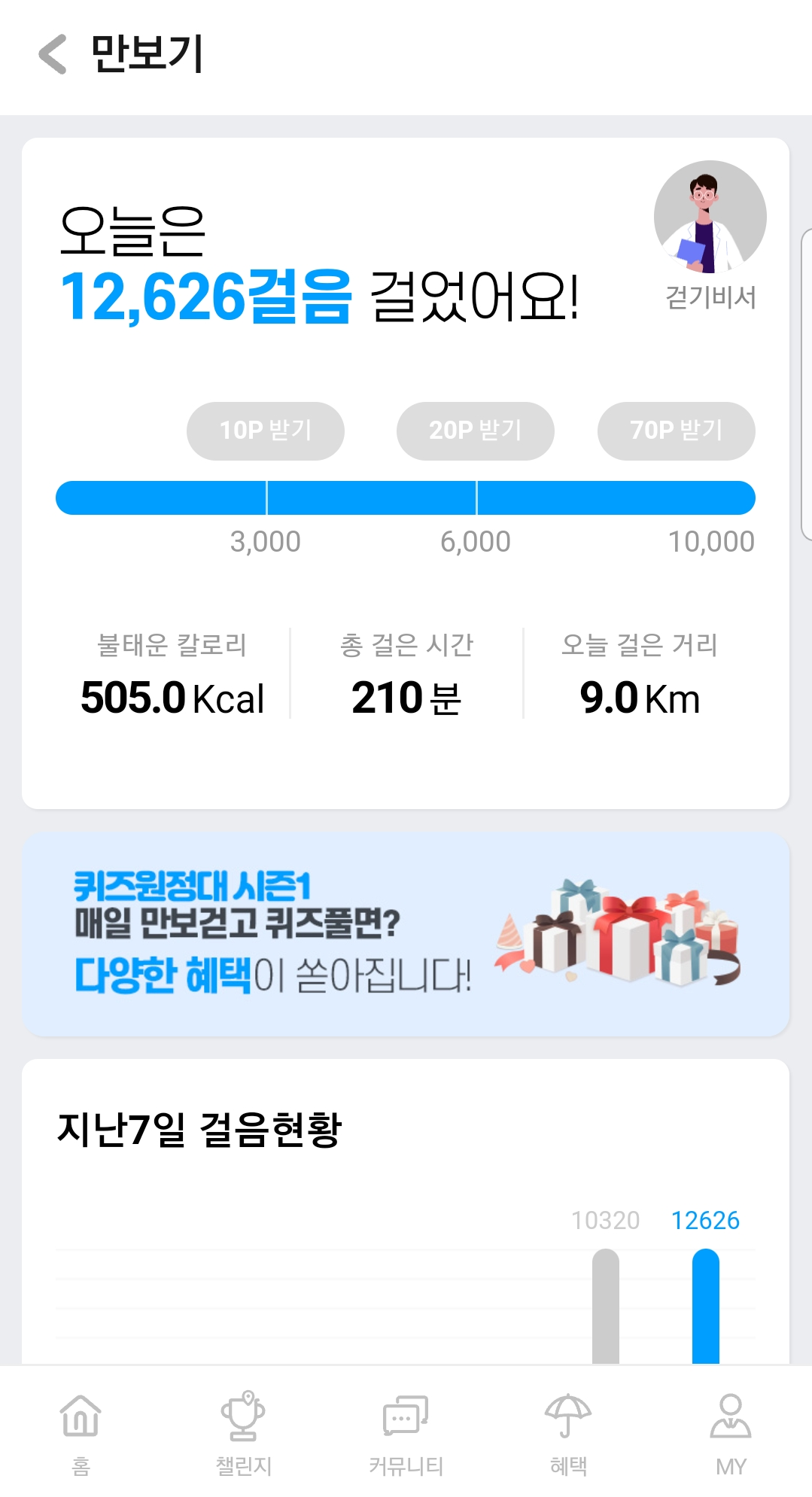 거기에 매일 1만보 달성 시 퀴즈를 풀어 추가포인트를 받을 수 있는 퀴즈원정대 기능이 있었는데