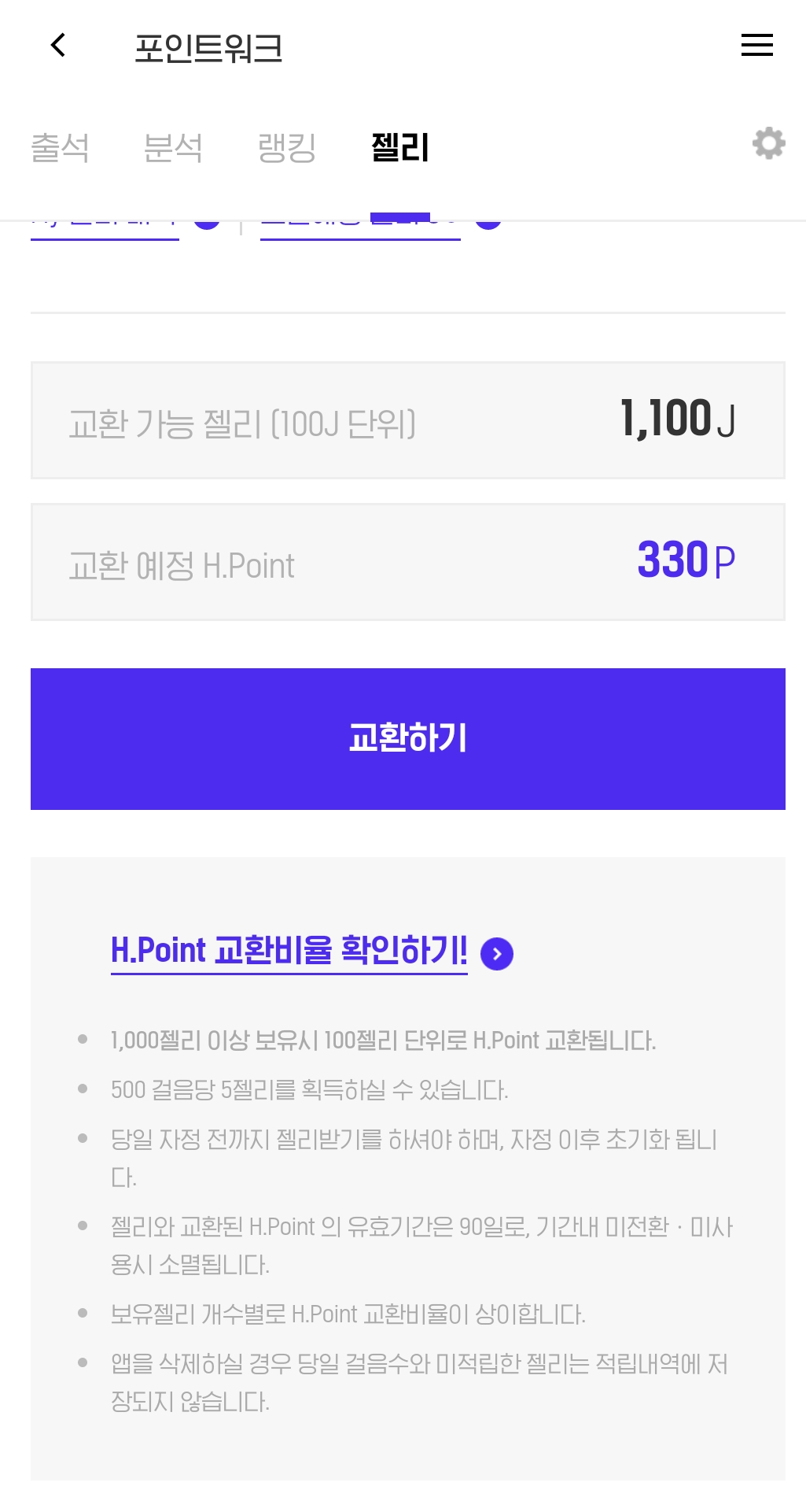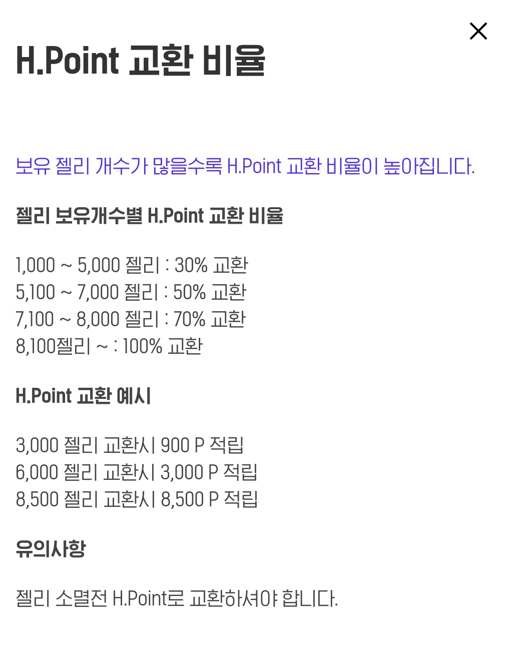 우선 모은 젤리는 젤리 수량에 따라 h포인트로 전환할 수 있다.