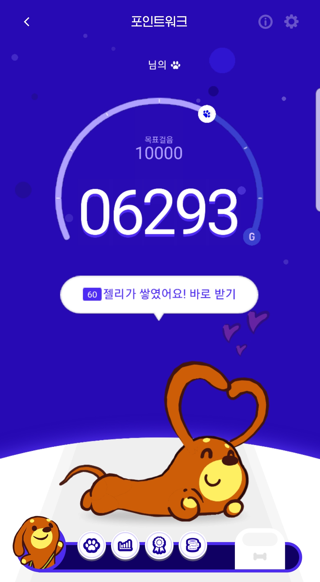 걸음을 걷고 나서 알림창을 통해 아래 화면으로 들어와서 젤리가 쌓였어요! 바로 받기 버튼을 누르면