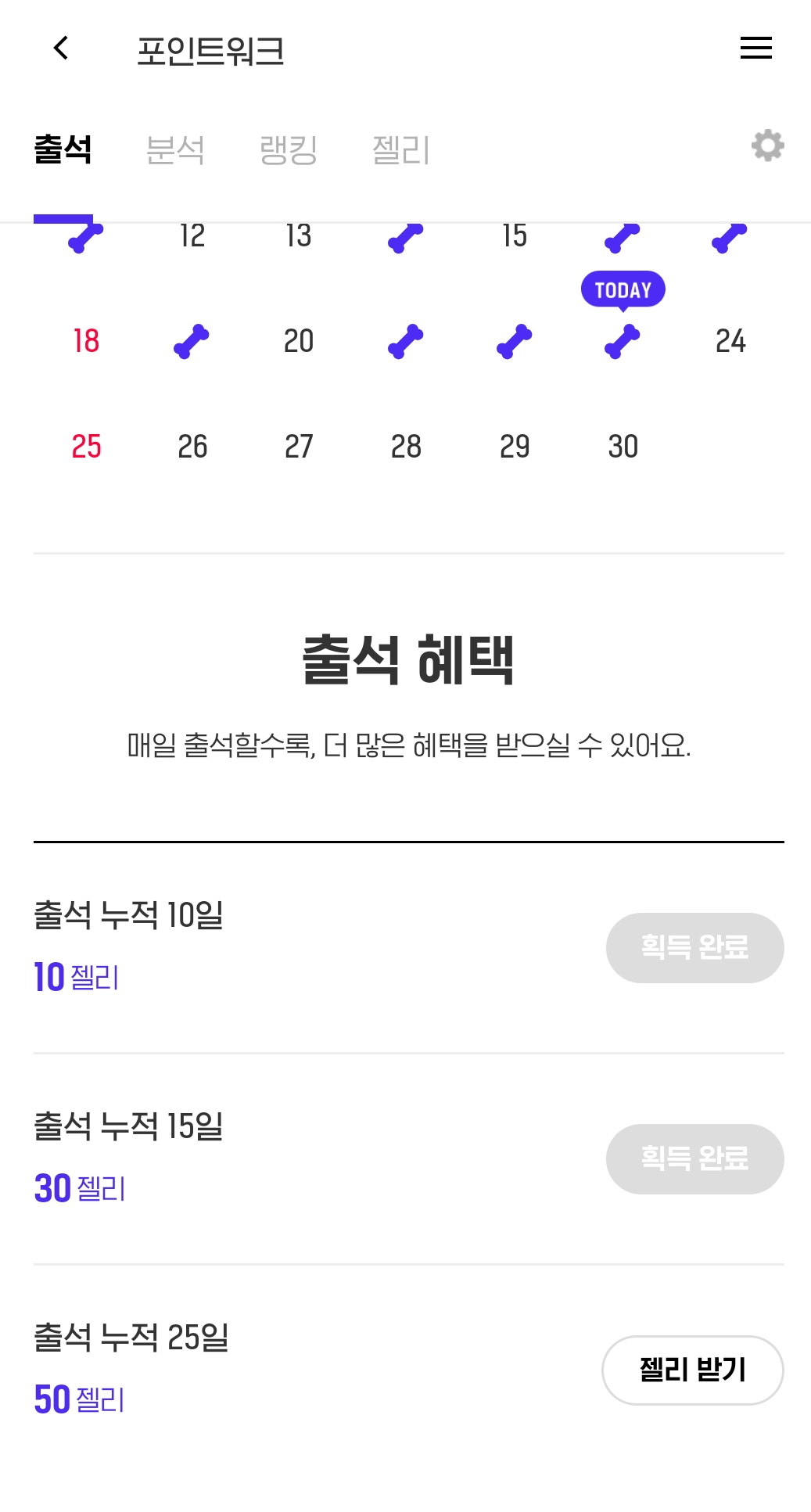 아래 화면에서 가장 오른쪽 밥그릇을 누르면 출석도 되는데 크진 않지만 출석을 통해 한달에 90젤리를 추가로 받을 수 있다.