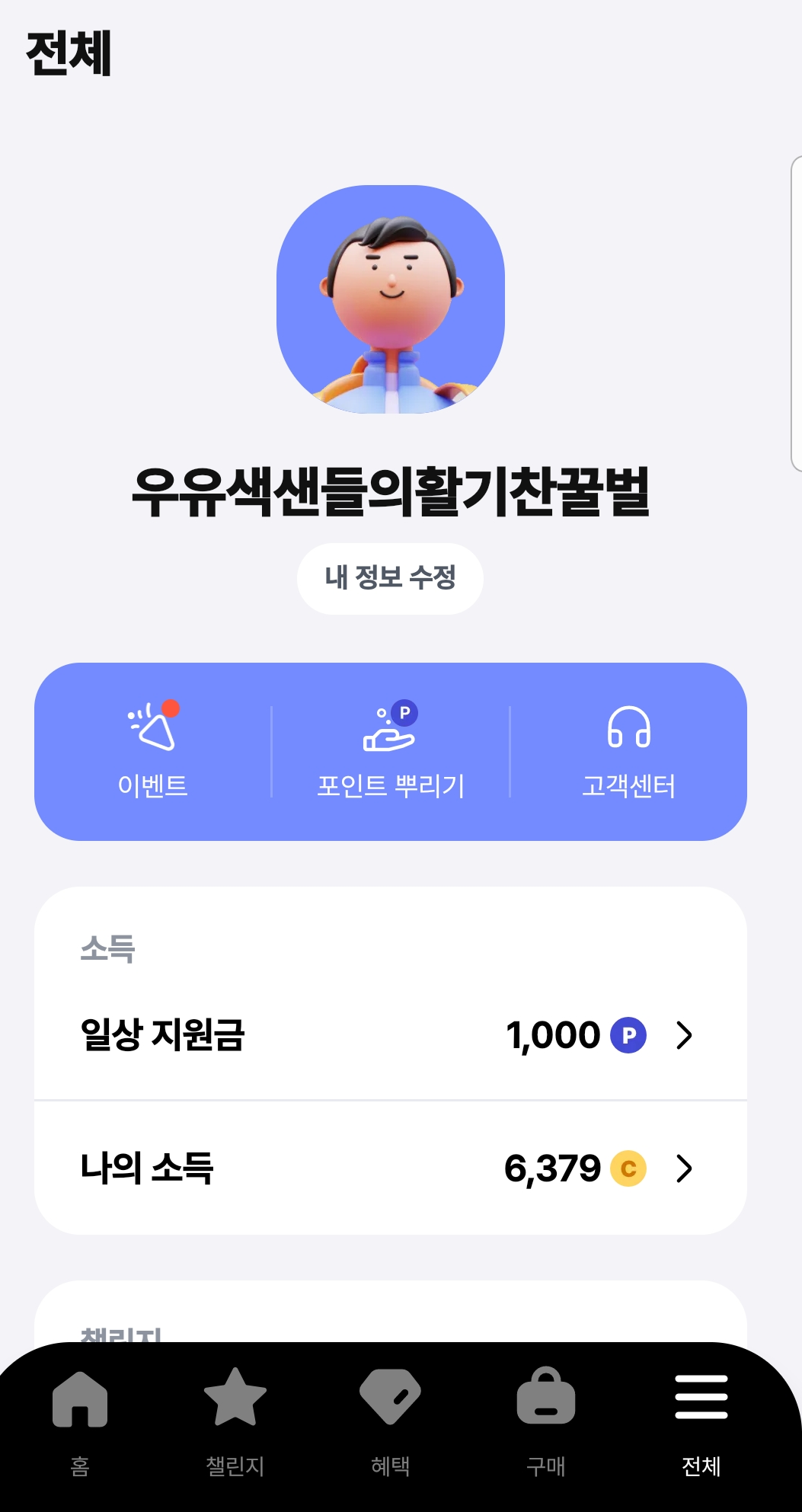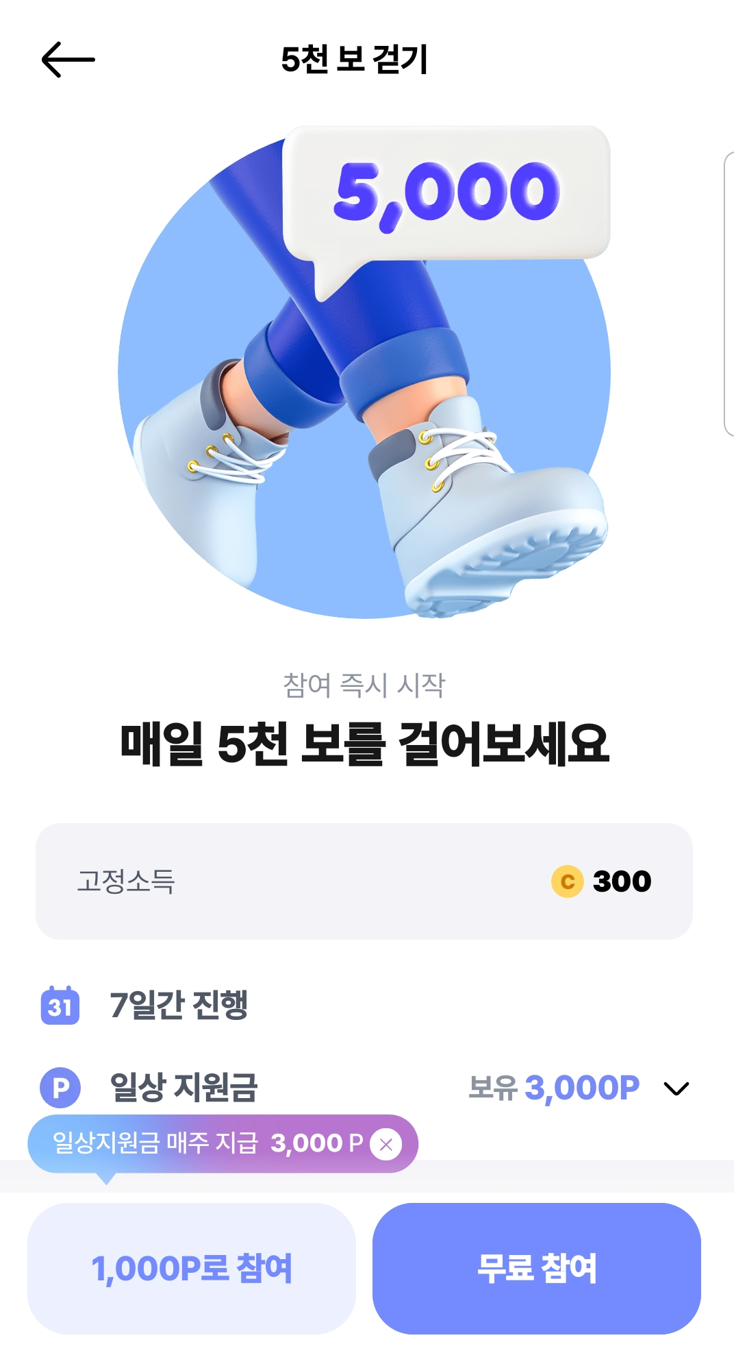 일주일에 일상지원금을 3천포인트 주는데 챌린지 하나를 신청하는데 1천 포인트가 소요된다.