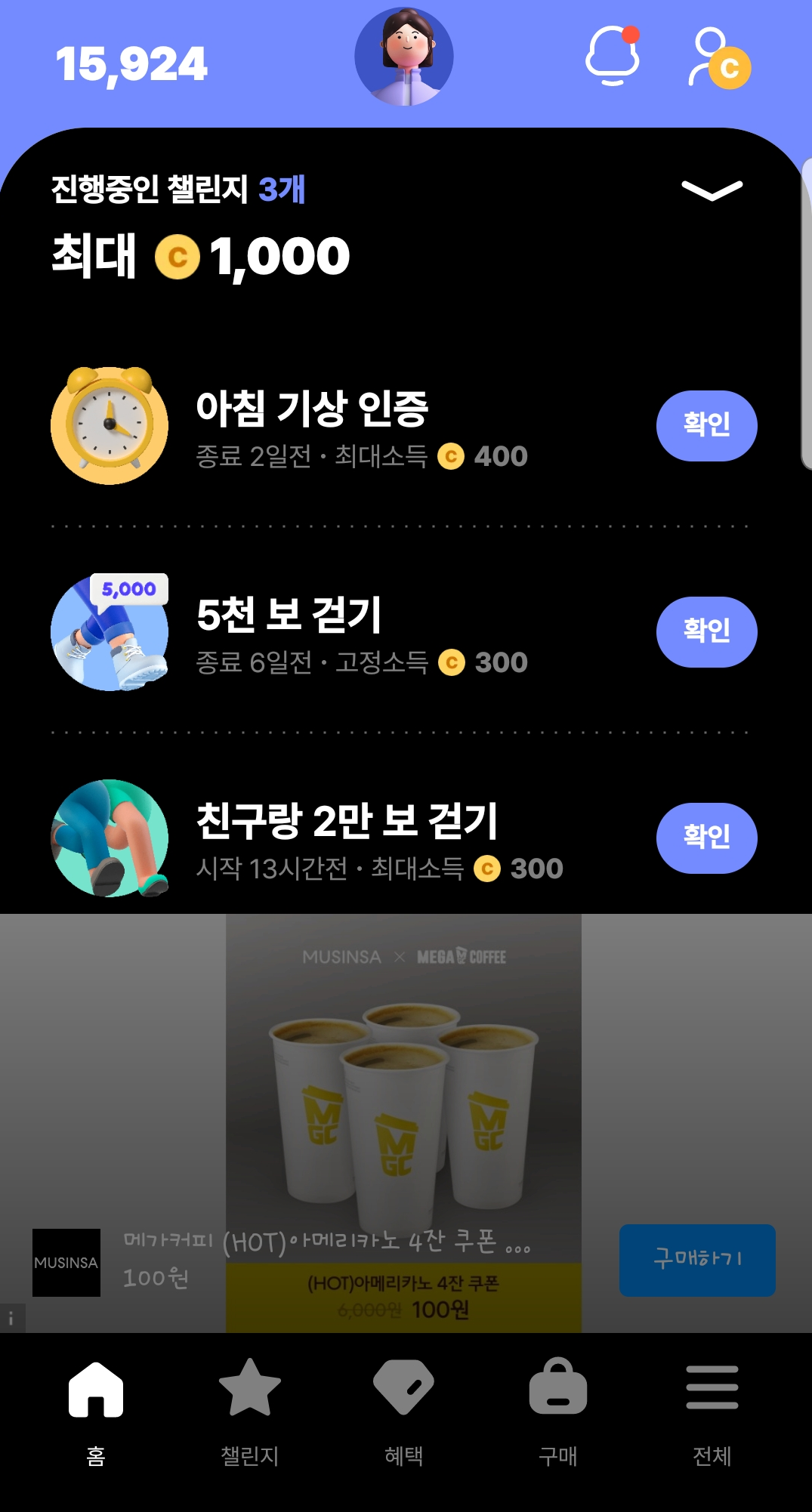 주요 수익 부분인 챌린지로 하루에 최소 100코인 이상을 받을 수 있기 때문에 효율이 아주 좋다.