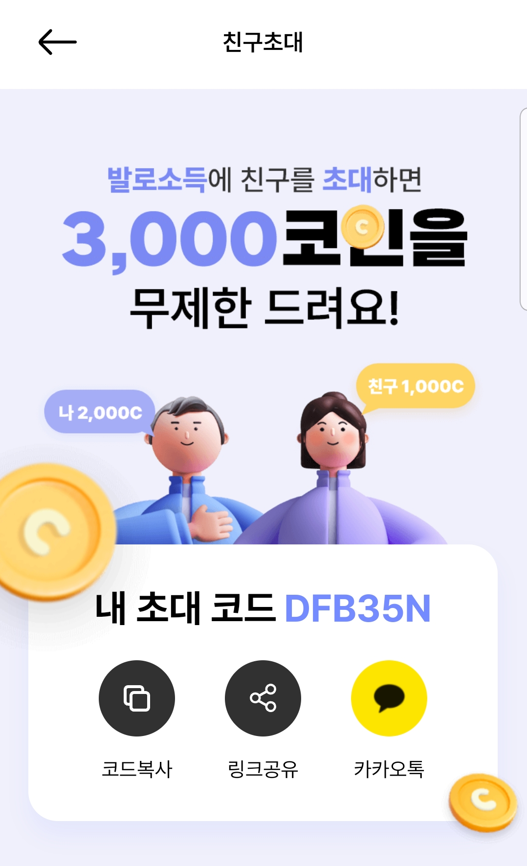 아직 가입안하신 분들은 발로소득 추천인 초대코드를 입력하면 1000코인을 받을 수 있다.